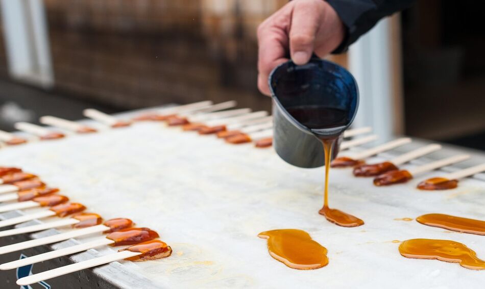 Making maple candy on snow in a maple sugar camp in New Brunswick